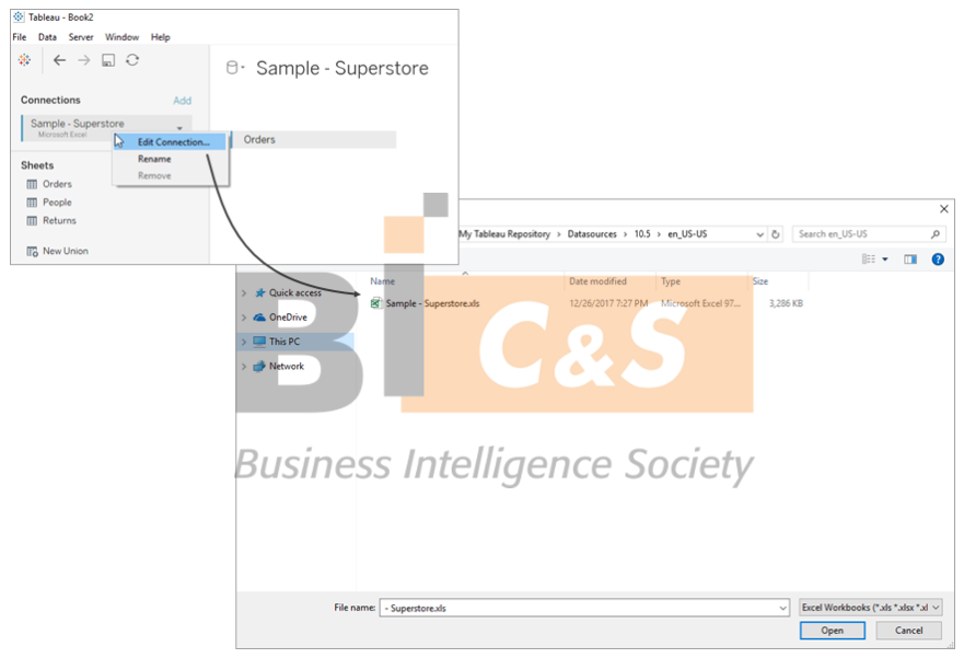 1. 데이터 패널에서 데이터 원본을 마우스 오른쪽 단추로 클릭(Mac의 경우 Control 클릭)하고 연결 편집을 선택합니다.