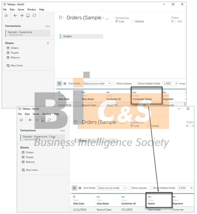 예를 들어 Customer Name 필드가 포함된 데이터 원본에 통합 문서가 연결되어 있다고 가정합니다. 모든 데이터가 동일하지만 Customer Name 대신 필드명이 Customer Name으로 변경된 새 데이터 원본을 가리키도록 데이터 원본을 편집합니다. Customer Name 필드가 데이터 패널에 그대로 있지만 유효하지 않은 필드를 표시됩니다. 이 필드를 유효하게 만들기 위해 참조를 바꿀 수 있습니다. 즉, 잘못된 필드를 새 데이터 원본의 유효한 필드에 매핑할 수 있습니다. (Customer Name은 Name에 해당함)