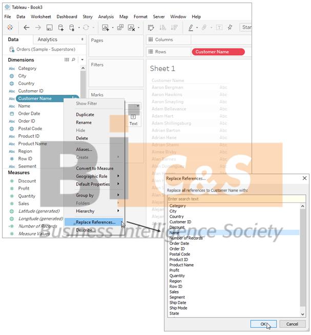 1. 데이터 패널에서 잘못된 필드를 마우스 오른 쪽 단추로 클릭(Mac의 경우 Control 클릭)하고 참조 바꾸기를 선택합니다.