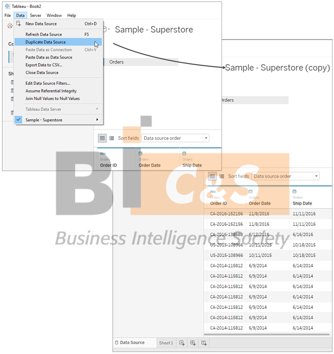 * 데이터 메뉴에서 데이터 원본을 선택한 다음 복제를 선택합니다.